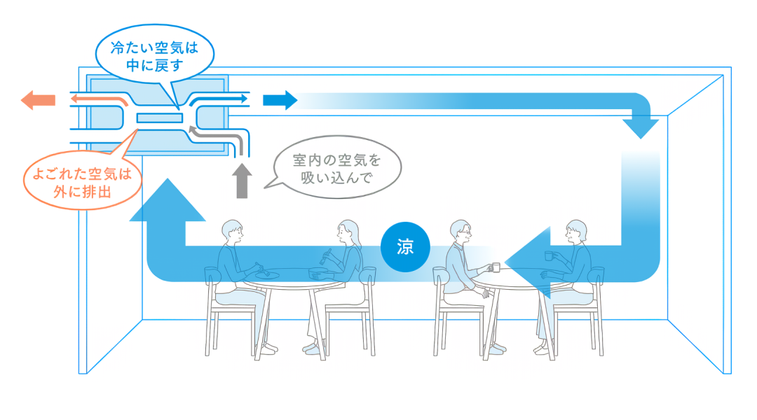 また、屋外に排出する空気から冷たさ・暖かさだけを回収して、屋内の空調に再利用する換気システムを搭載。環境にもやさしく、エネルギーロスの少ない排熱回収換気を実現している。