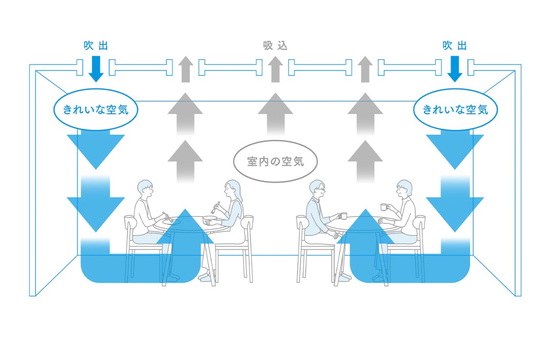 レストランのフロアには、新たに独自開発した空調システム「エアフォール空調」を用いている。天井から床に向かって低速できれいな空気を落下させ、ウィルス・花粉といった粒子状物質を含んだ室内の空気を天井に押し上げて排気する。