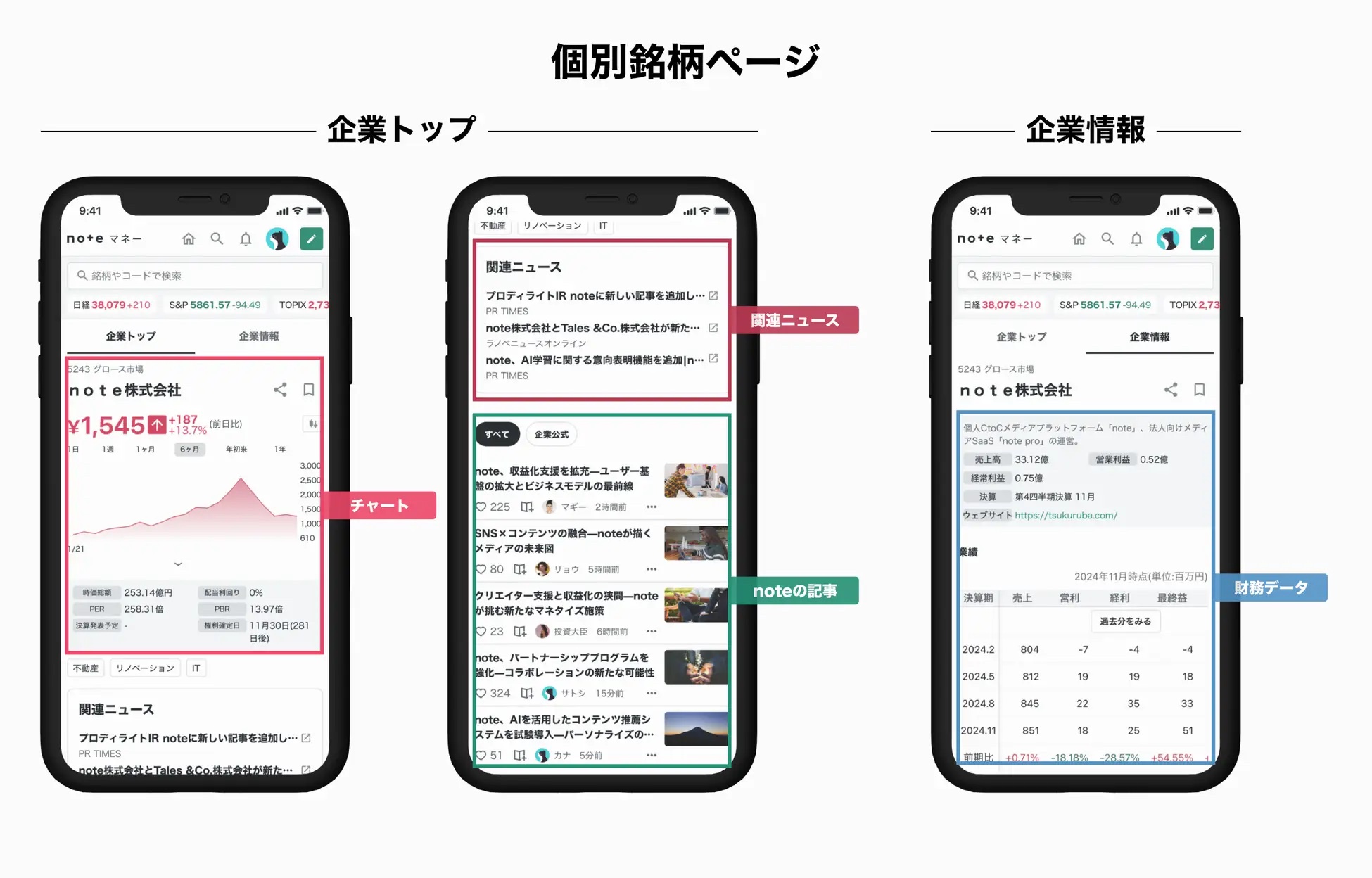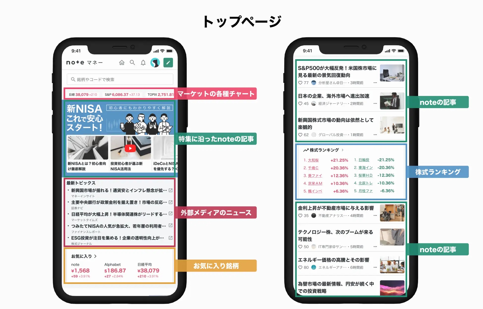 「noteマネー」では、金融アナリストや経済ジャーナリストなど専門家による分析や業界動向の解説、個人投資家の体験談、企業のサービス利用者の口コミや評判などを参照できる。また、株式指数や個別銘柄の株価など、市場動向の把握に役立つチャートも提供される。これらのチャートは記事に埋め込むことができ、視覚的に分かりやすい情報発信が可能になるという。