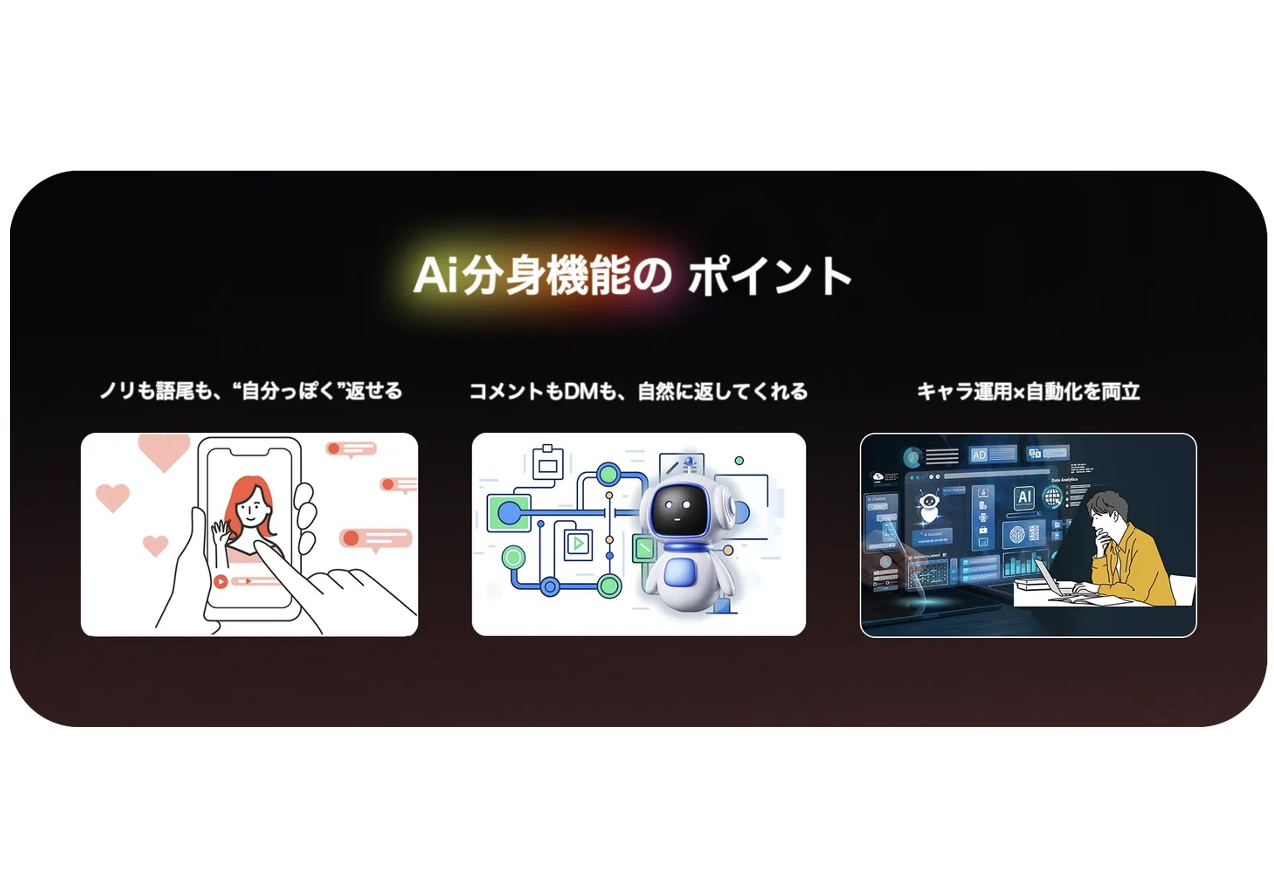「分身AI」は、語尾、テンション、口調といったユーザーの個性をAIが学習し、それを反映した自然な自動返信を生成できる。ユーザーは、自分のノリや世界観を維持しながらコメントやDMへの対応を自動化できるため、まるで“もう一人の自分”がファンと親密なコミュニケーションを取っているような感覚を得られるという。