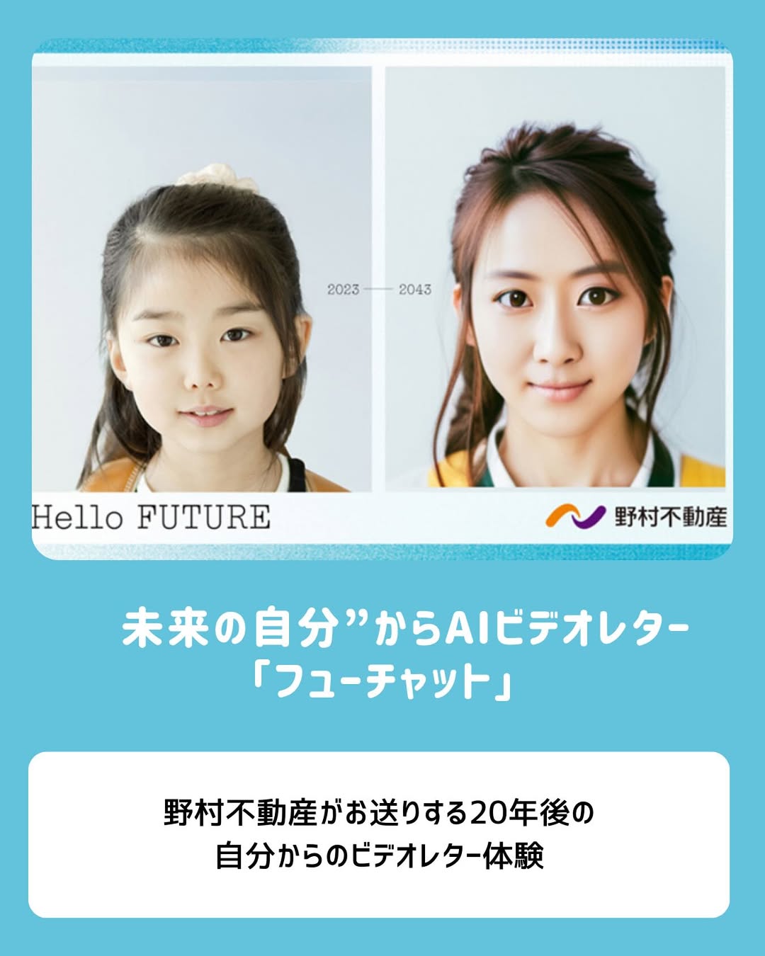 テキスト、画像、動画のオープンAIを掛け合わせた独自のシステムで、写真・名前・性別・年齢・将来の夢をスマートフォンから入力するだけで、未来の自分がメッセージを語りかけてくるオリジナル動画を参加者に提供する。