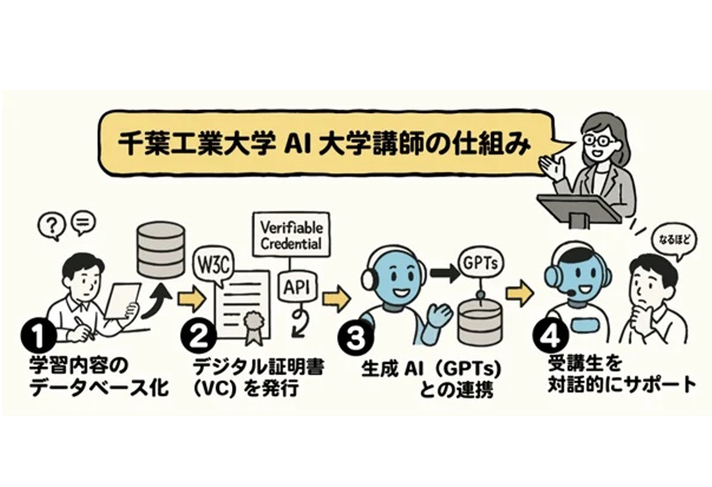 AI大学講師は、単なるAIチャットボットではなく、学習データのデータベース化、VC(国際標準規格であるVerifiable Credential)の発行、生成AIとの連携、そして対話的サポートという4段階のプロセスで機能する。学生のあらゆる学習活動をデジタルデータとして記録し、それを改ざん不可能で永続的に保存可能なVCとして発行。このVCをカスタマイズされたChatGPTに連携させることで、AIが学生一人ひとりの学習履歴や特性を分析し、最適なタイミングで適切な問いかけや助言を行うという仕組みだ。