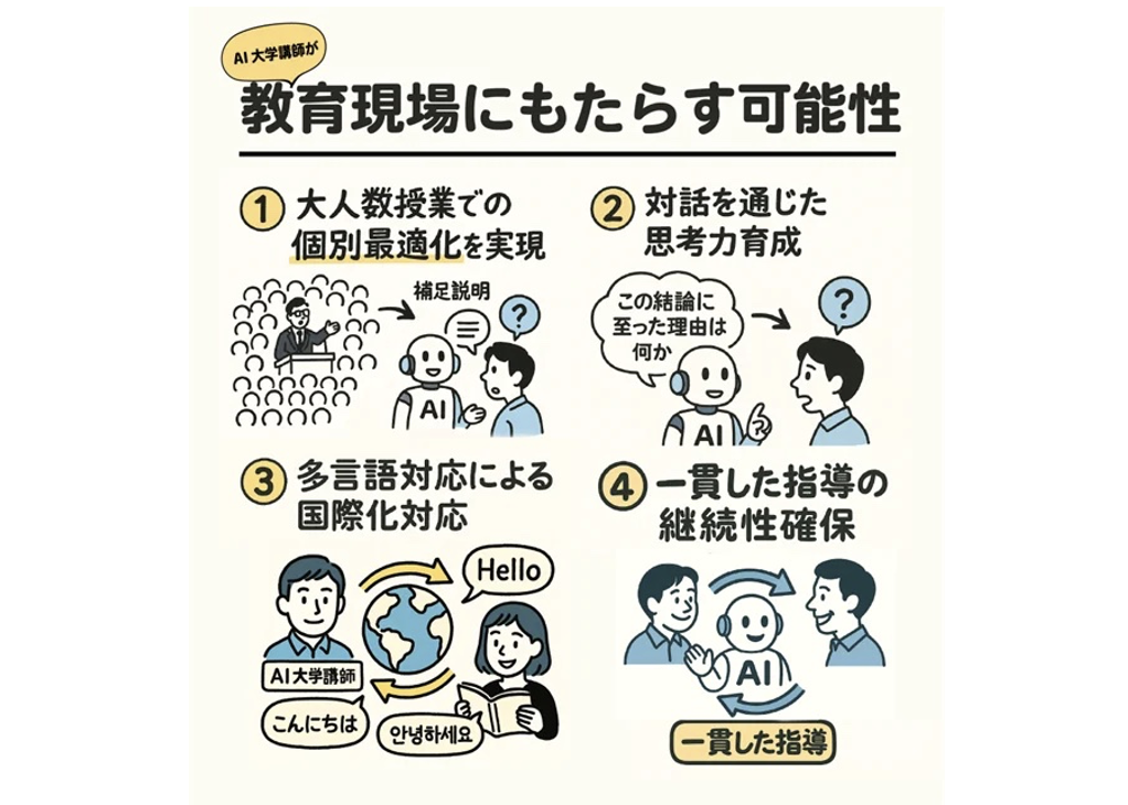 実験結果は、今後の全国の大学への展開計画に活かされる予定。「AI大学講師」の導入は、大規模講義と個別最適化の両立、対話型学習による思考力の向上、多言語対応によるグローバル教育の強化、そして一貫性のある継続的な学習支援の提供といった、高等教育における新たな価値創造に繋がることが期待されている。
