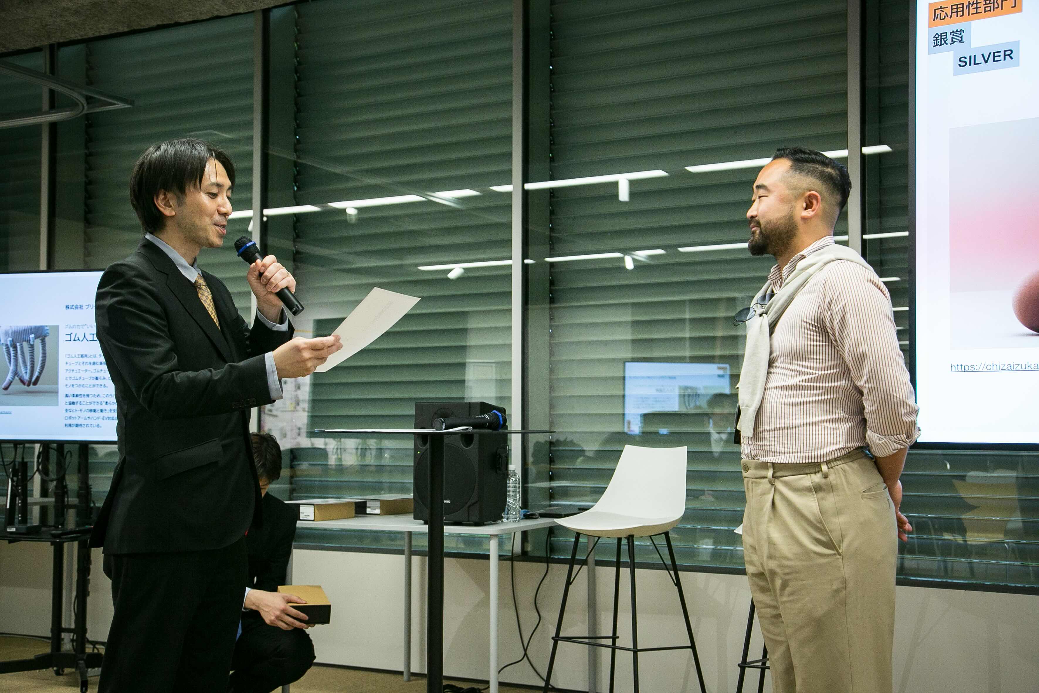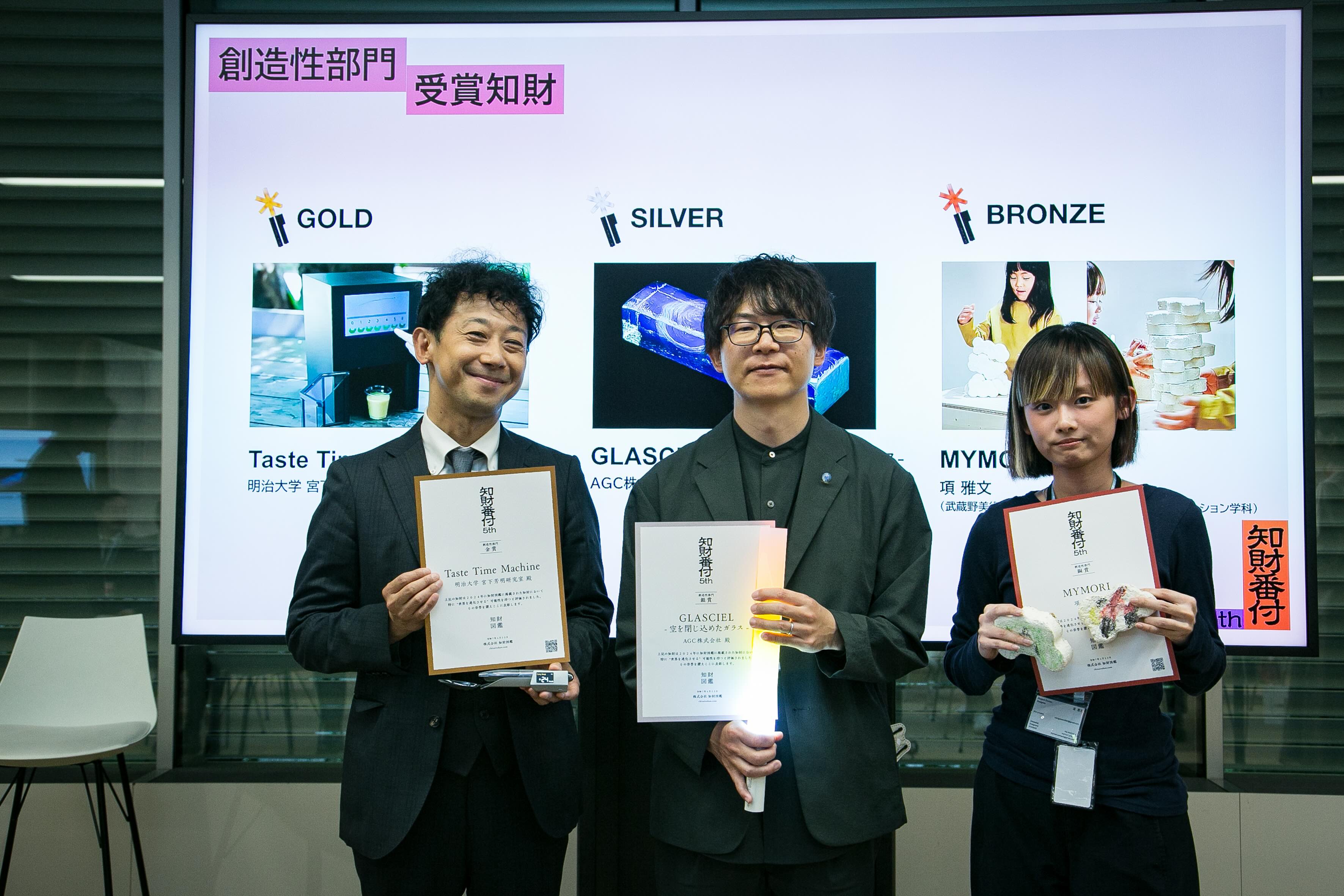 授賞式では、知財図鑑編集長の荒井亮をはじめ、クリエイティブディレクターの出村光世、CTOの荻野靖洋、ベースドラム株式会社の森岡東洋志氏らが登壇し、各受賞知財について講評を述べました。