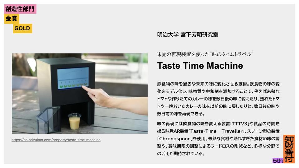 飲食物の味を過去や未来の味に変化させる技術。飲食物の味の変化をモデル化し、味物質や中和剤を添加することで、例えば未熟なトマトや作りたてのカレーの味を数日後の味に変えたり、熟れたトマトや一晩おいたカレーの味を以前の味に戻したりと、数日後の味や数日前の味を再現できます。(詳細)